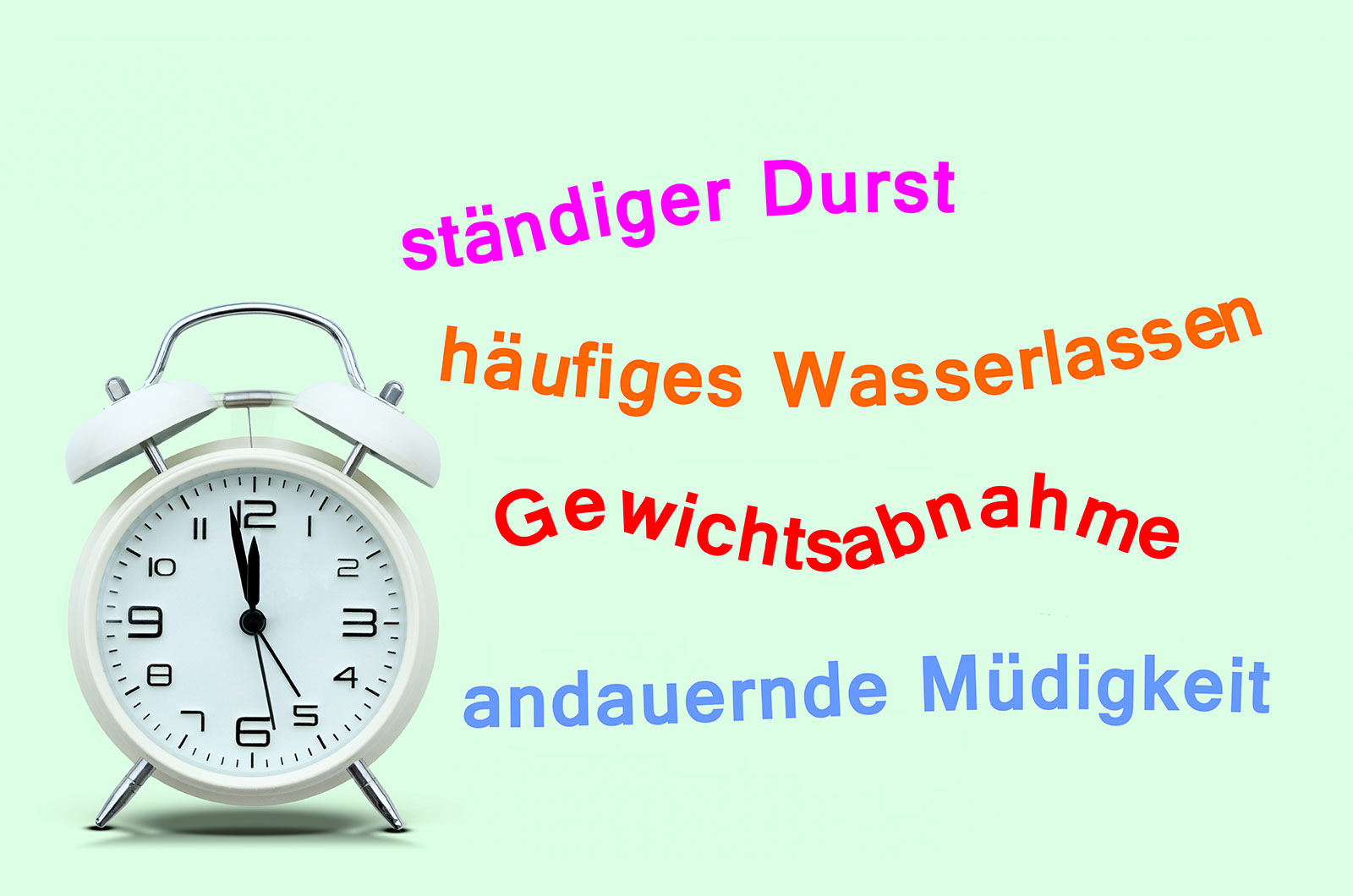 Im Mittelpunkt stehen vier wichtige Warnzeichen für eine Diabeteserkrankung: ständiger Durst, häufiges Wasserlassen, Gewichtsabnahme und andauernde Müdigkeit.