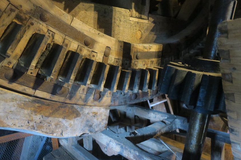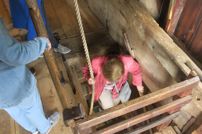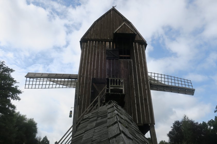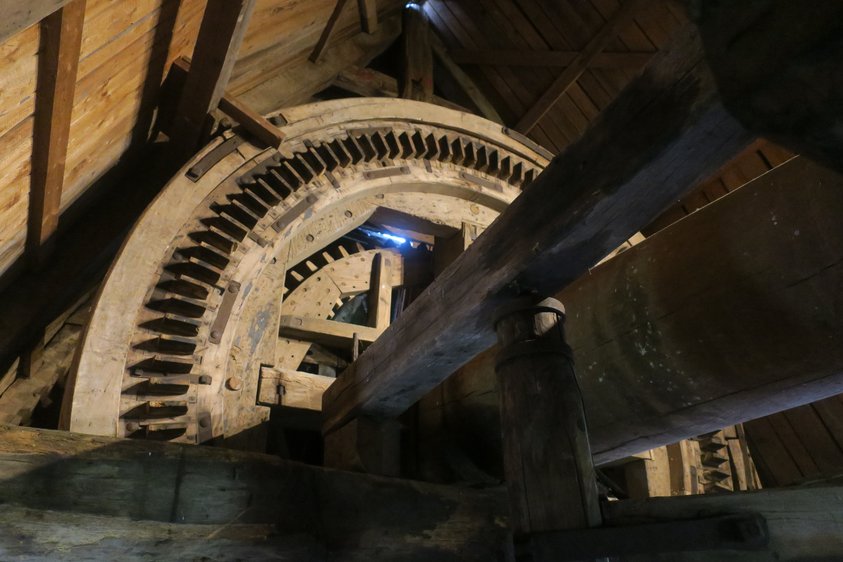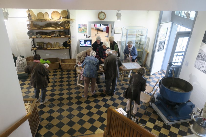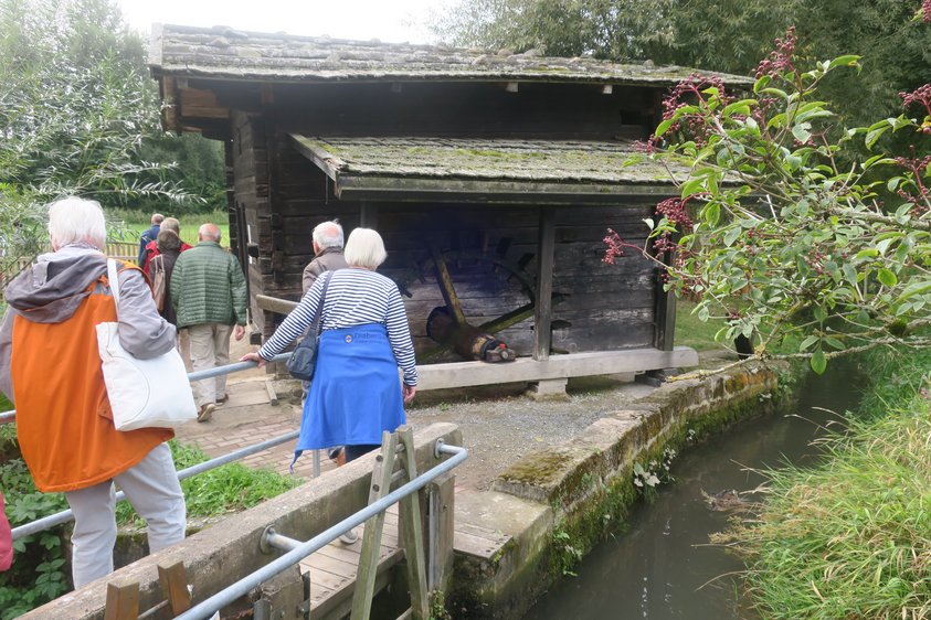 Während die Brote im Ofen backen, geht es über das Freigelände des Museums. Dort wartet zunächst ein Kräuter- oder Apothekergarten – und schließlich eine Bockwind- sowie eine Wassermühle. Beide werden lebhaft von einem örtlichen Müller vorgestellt. Einziger Wermutstropfen: Nachdem sich der Bus auf der Hinfahrt den Weg durch strömenden Regen bahnen musste, strahlt nun zwar die Sonne – dafür ist es aber völlig windstill, weshalb in der voll funktionstüchtigen Windmühle alle Räder still stehen. „Wenn wir jetzt ein wenig Luft auf dem Flügelkreuz hätten, dann würde das ganze Ding so richtig schön hin und her schwanken“, erzählt der Müller. Einige sind da angesichts der Höhe im Obergeschoss der Mühle und ihrer mehr als 200 Jahre alten Holzplanken doch ganz froh über das ruhige Wetter.
