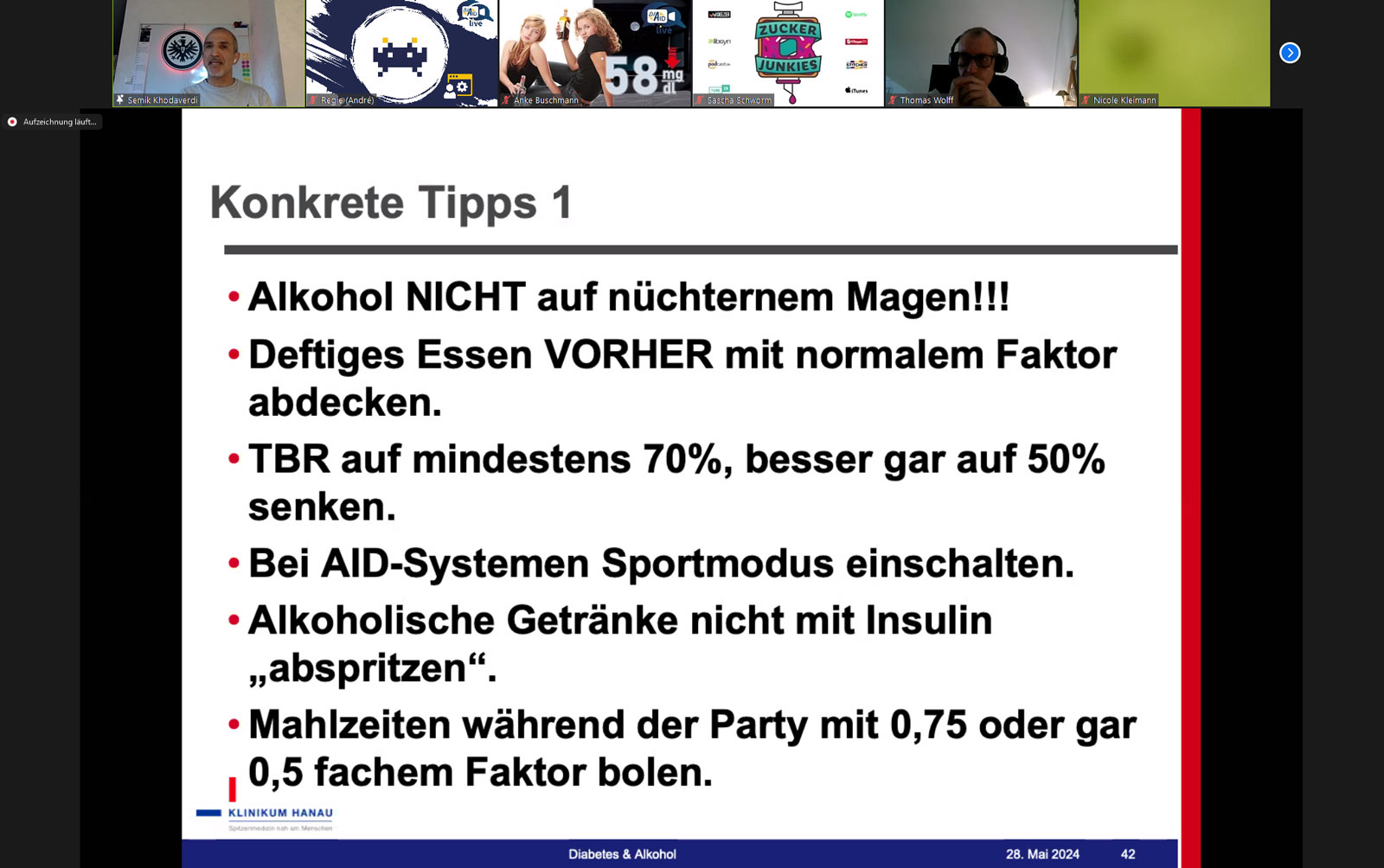 Und da wir nun schon bei allerlei komplizierten Gemengelagen waren, kommt auch hier noch ein Umstand dazu, die die Angelegenheit zusätzlich schwierig macht: „Die zuckersenkende Wirkung des Alkohols tritt sehr, sehr verzögert ein“, so Semik. Konkret bedeutet das, dass gerade in der Nacht nach einer Party die Gefahr einer kritischen Unterzuckerung drohe. Man könne also nach dem Alkoholkonsum gegen 2 Uhr mit einem Wert von 120 mg/dl ins Bett gehen, habe dann um 4 oder 5 Uhr nur noch einen Wert von 60 oder 50 mg/dl – und befinde sich drei weitere Stunden später in der schweren Hypoglykämie. Insgesamt gelte es zu beachten, dass der Blutzuckerwert auch 12 Stunden nach dem letzten Bier noch sinken könne.