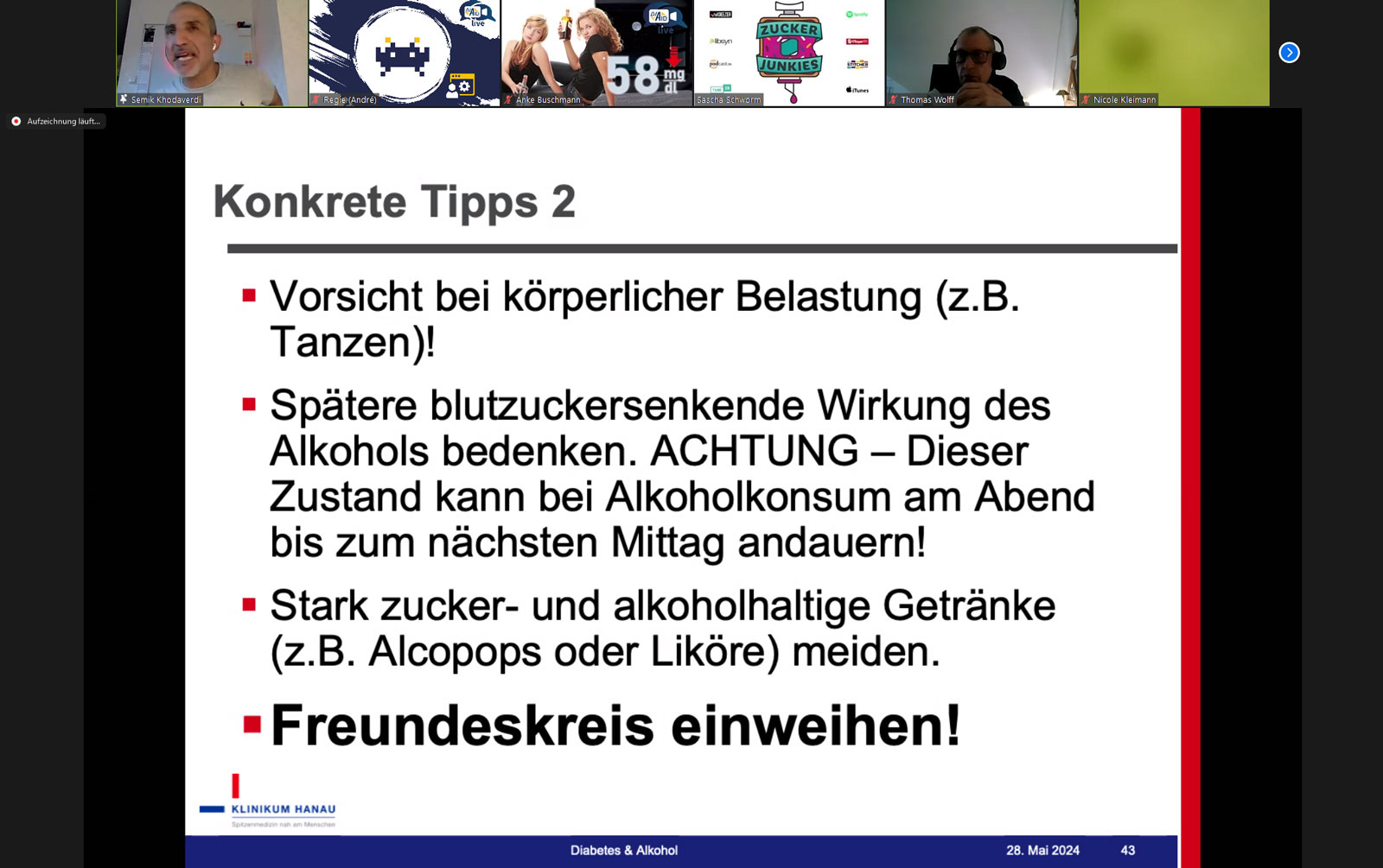 „Und was ich noch dringend empfehle“, betonte Semik zum Schluss hin, „ist, dass Eltern die Ersterfahrungen von Alkohol trinkenden Jugendlichen teilen.“ Mit anderen Worten: Eltern sollten mit dem Nachwuchs durchaus mal gemeinsam ein Bier trinken – und dann zusammen den Blutzucker im Auge behalten. So ließen sich einerseits gemeinsam Erkenntnisse gewinnen. Und andererseits sei dann auch die Hemmschwelle der Jugendlichen niedriger, ihre Eltern von vornherein einzuweihen, wenn sie mal feiern gingen.