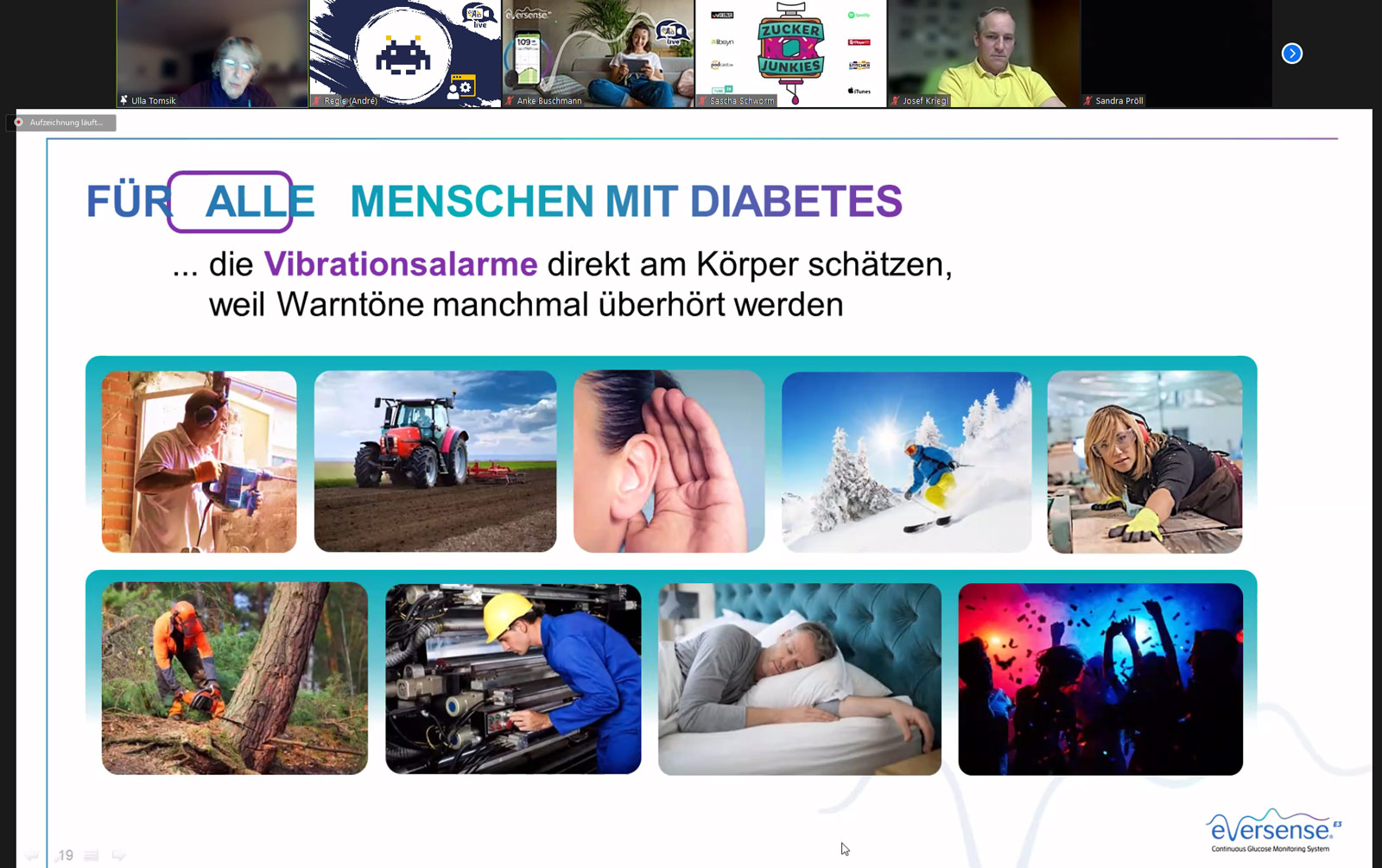Ebenfalls als sehr praktisch wurden die Vibrationsalarme des Transmitters beschrieben. Diese informieren mit unterschiedlichen Vibrationsmustern über hohe oder niedrige Werte, was – so betonte die Diabetesberaterin Ursula Tomsik – sehr nützlich sei, wenn man mal nicht die Gelegenheit habe, aufs Handy zu schauen. Auch in sehr lauten Umgebungen – etwa bei der Arbeit oder auf einer Party – oder in Situationen, wo ein lauter Alarmton des Handys eher unerwünscht sei – etwa in Meetings oder im Theater –, könne der Vibrationsalarm gute Dienste leisten.