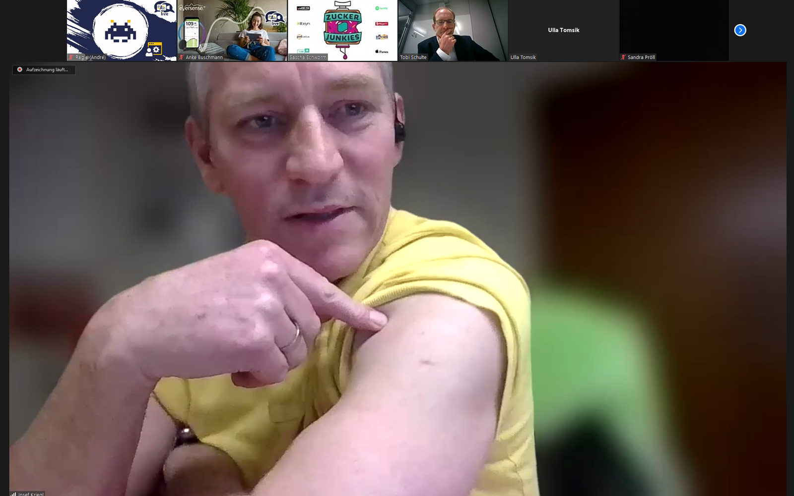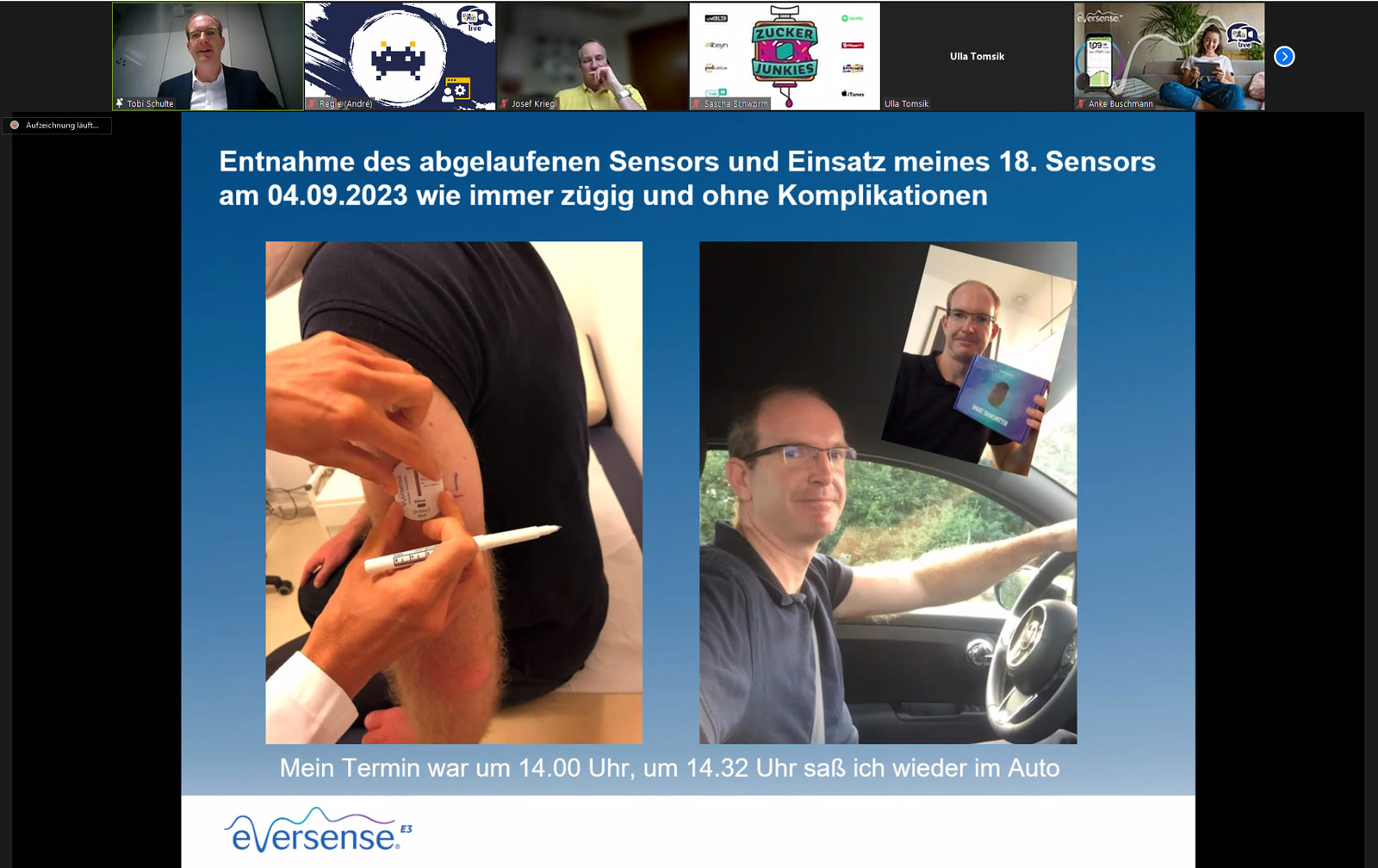 Der größte Vorzug sei dabei, so betonte Josef, dass man „ein halbes Jahr seine Ruhe“ habe. Als sehr praktisch beschrieben die beiden aber auch die Tatsache, dass man den Transmitter – er wird mittels eines täglich neuen Pflasters auf Silikonbasis über dem Sensor befestigt und sendet die Blutzuckerwerte an die „Eversense“-App auf dem Smartphone – sehr unproblematisch auch mal abnehmen könne. Damit beantwortete sich – quasi wortwörtlich „im Vorbeigehen“ – auch eine weitere Nachfrage eines Teilnehmers: Ob man den Sensor nicht auch an einer anderen Körperstelle als am Oberarm tragen könne, wollte dieser wissen, schließlich könne man ja mit dem Transmitter am Oberarm mal am Türpfosten hängen bleiben. „Das ist doch kein Problem“, meinte Josef, „selbst wenn – einfach wieder drauf und fertig!“