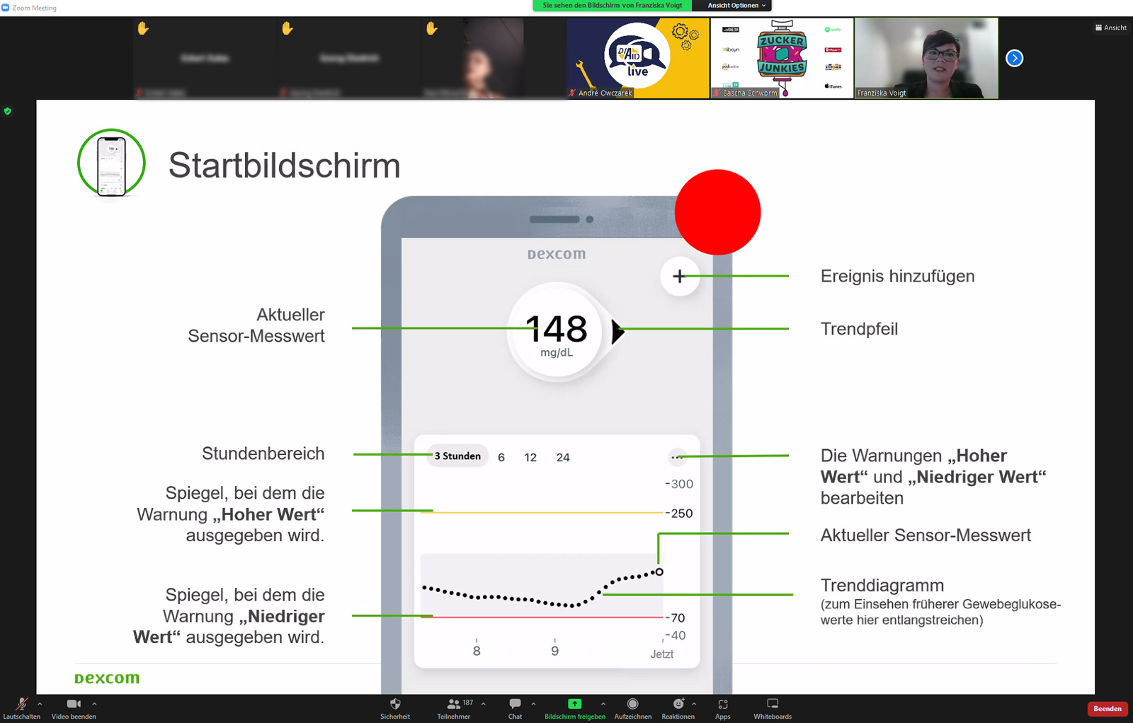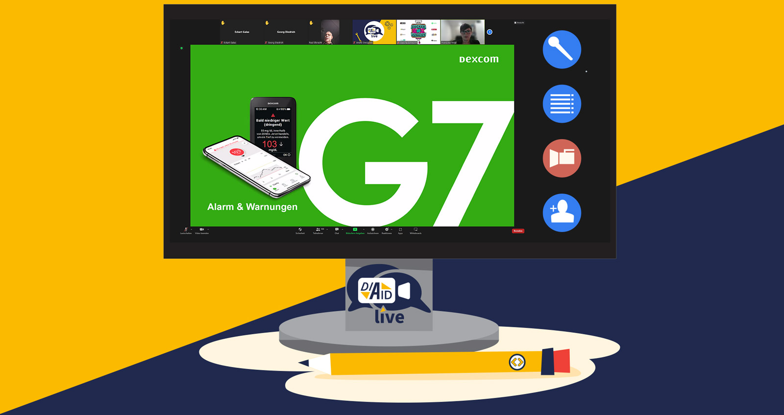 Über all diese Neuerungen klärte Dexcom-Vertreterin Franziska Voigt im Rahmen der jüngsten DIA AID live-Veranstaltung gewohnt kundig und anhand einer übersichtlichen Präsentation auf. So richtig lebhaft wurde es aber – wie eigentlich immer in unseren Konferenzen – nach der Präsentation. Nun wurde Franziska Voigt mit Fragen gelöchert – und musste direkt für ein wenig Enttäuschung sorgen: Denn wann es eine Kompatibilität des G7 mit Insulinpumpen im Sinne eines AID-Systems – wie beim G6 etwa mit der Ypsopump oder der t:slim X2 – geben wird, steht derzeit noch in den Sternen.