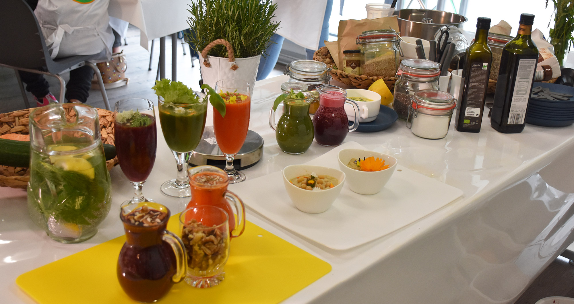 Gemeinsam wurde geschnibbelt, gestiftelt, gemixt, gemanscht und gepanscht was das Zeug hält. Die Ergebnisse am Ende konnten sich sehen lassen. Neben eher außergewöhnlichen Smoothies aus Löwenzahn und Pampelmusen kamen u.a. auch eine sehr leckere Maissuppe und knackige Süßkartoffelpommes nebst selbstgemachtem Ketchup dabei heraus. Letzterer natürlich mit wesentlich weniger Zucker als das Vorbild aus Industrieproduktion.