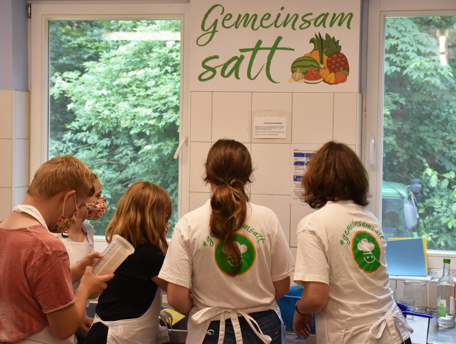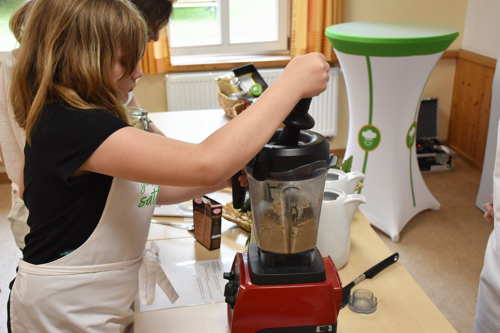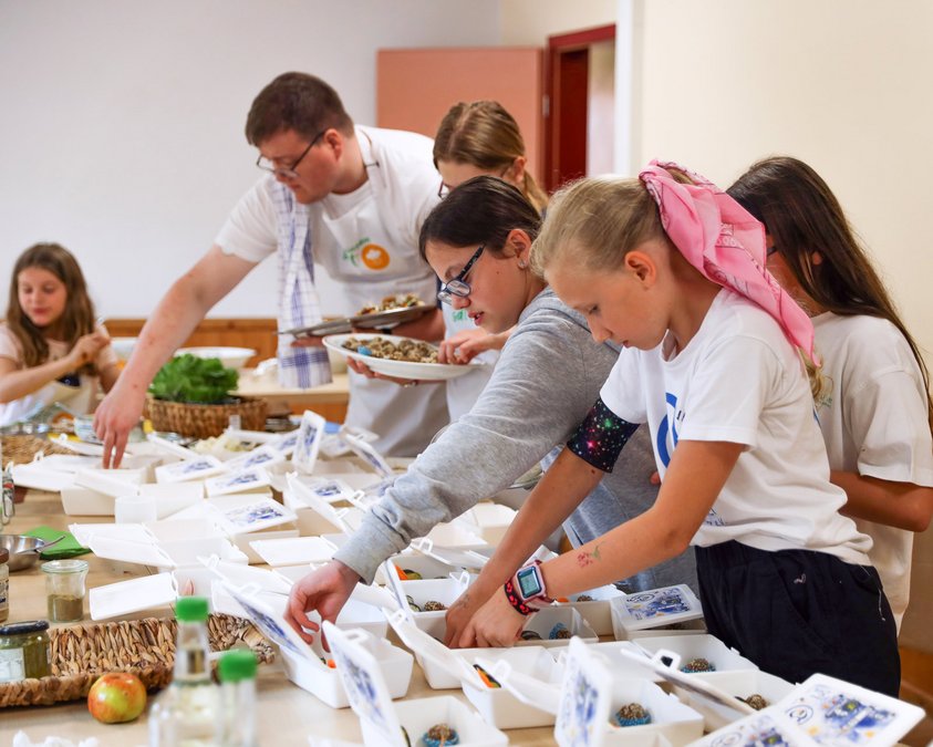 „Die Größeren konnten mit dem ausgedruckten Rezept dann sofort loslegen“, berichtet die Ernährungsexpertin, „die Kleineren brauchten natürlich noch ein wenig mehr Einweisung. Aber das ist ja auch okay! Ich fand übrigens sehr bemerkenswert, wie großartig die einzelnen Gruppen sich die Arbeit dann untereinander aufgeteilt und wie reibungslos sie zusammengearbeitet haben.“