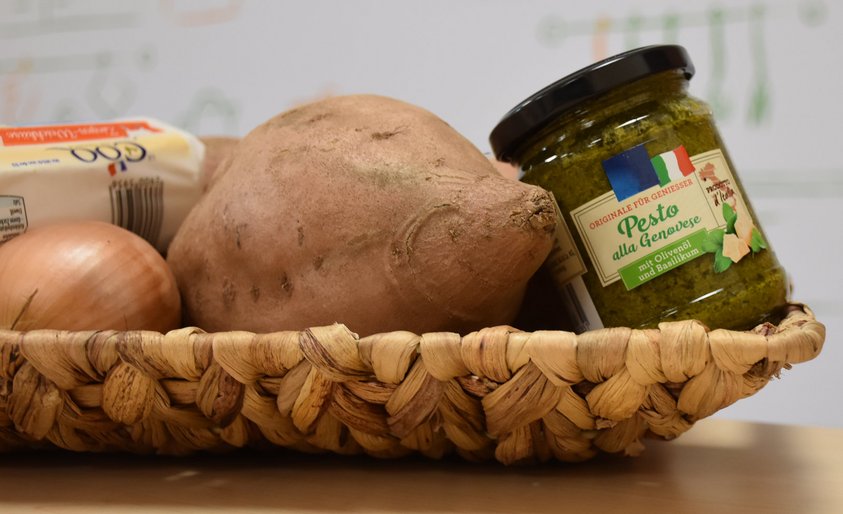 Wie zu einer Galerie sind direkt neben dem Eingang Kräuter aufgebaut: Petersilie, Rosmarin oder auch Lavendel. Das ist schon einmal etwas ganz anderes, als die allzu häufig eingesetzten getrockneten Gewürze aus dem Streuer. Hier kann man die unterschiedlichen Blattformen sehen und fühlen, kann sie zwischen den Fingern reiben und den Geruch erschnuppern. Gegenüber stehen fertig gepackte Körbe, in denen Regina Kröger die Zutaten für jeweils ein Rezept zusammengestellt hat und aus denen die Kinder sich dann etwas aussuchen konnten.