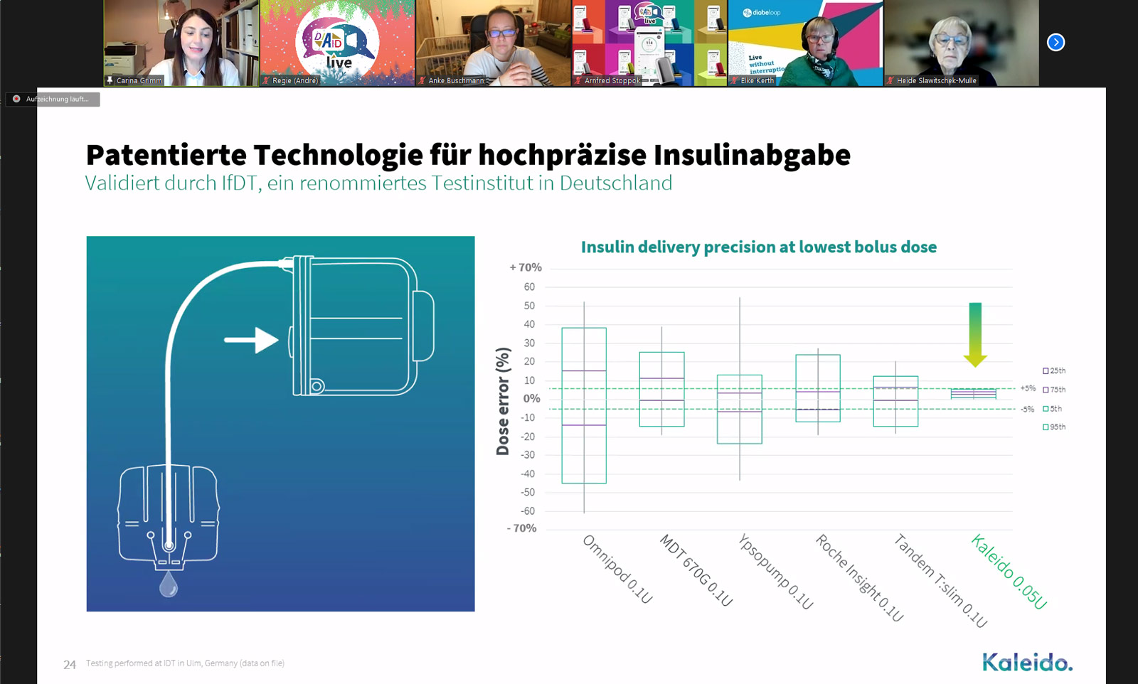 Zuletzt haben Patchpumpen immer größere Aufmerksamkeit auf sich gezogen – etwa, weil sie bei Bewegung weniger stören. Andere schwören auf die Nutzung von „klassischen“ Schlauchpumpen – beispielsweise, weil sie sich sehr einfach auch mal „abkoppeln“ lassen. Die Insulinpumpe Kaleido des vergleichsweise jungen niederländischen Medizintechnik-Unternehmens ViCentra lässt Nutzerinnen und Nutzern nun die Wahl – und funktioniert in Verbindung mit dem rtCGM G6 von Dexcom sowie dem DBLG1-Algorithmus von Diabeloop auch als AID-System. Im Rahmen der jüngsten DIA-AID-live-Veranstaltung stellten Carina Grimm von ViCentra und Elke Kerth von Diabeloop das System kompetent und kurzweilig vor.