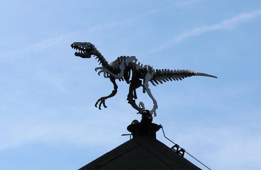 Am Samstagnachmittag ist es dann soweit. Herr Uwe Stratmann vom Kreisforstamt Schaumburg empfängt die Gruppe vor dem JBF-Centrum am Infopavillon – dessen Dach bezeichnender Weise von einem Dino-Skelett gekrönt wird.
