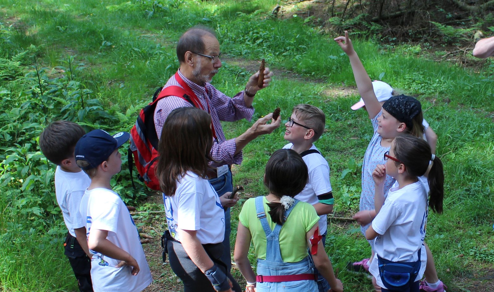 Dann geht es einmal quer über das JBF-Gelände direkt in den Wald. Immer mal wieder gibt es Pausen, hier und dort erzählt Herr Stratmann Wissenswertes zum Wald und zur Geschichte des Bückebergs. So kommt die Gruppe unter anderem an einer mehr oder weniger direkt in den Berg gebauten Hütte vorbei, die einst der Vorratsraum („Felsenkeller“) einer hier in einer Waldhütte lebenden Familie war. Auch der Kohlebergbau hat Spuren hinterlassen. Ein von einem mitwandernden Mädchen zunächst als Meerschweinchenhäuschen identifiziertes Steinobjekt entpuppt sich als das obere Ende eines Lüftungsschachts, der die Bergleute unter Tage einst mit Sauerstoff versorgte. „Der Bückeberg“, so erklärt Herr Stratmann, „ist durchlöchert wie ein Schweizer Käse“.