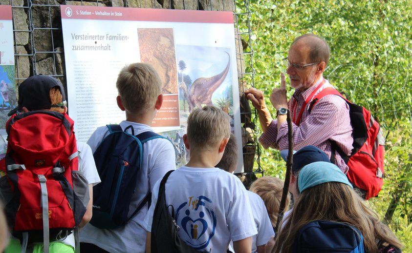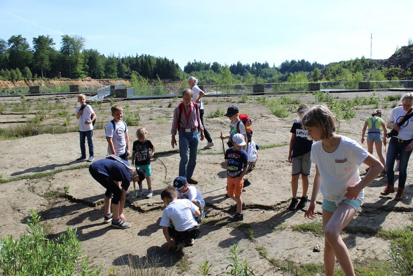 Das ist zum Glück nicht mehr allzu lange hin. Und als die Gruppe den Steinbruch erreicht, ist bei den Kindern augenblicklich der Forschergeist geweckt. Vor 140 Millionen Jahren befand sich hier eine Lagune. Eine an den Nordseestrand bei Ebbe erinnernde und heute wellenartig versteinerte Bodenstruktur lässt das auch heute noch lebendig werden. Noch lebendiger werden allerdings die Dinosaurier, die hier damals im Schlick ihre Spuren hinterlassen haben. Mit geschultem Blick – oder mithilfe der Erklärung des Experten – lassen sich unterschiedliche Dino-Arten erkennen. Pflanzenfresser wie der Iguanodon waren hier unterwegs, verschiedene Raubsaurier stellten ihnen nach. Manche hatten es auch sehr eilig. Das ist daran zu erkennen, dass sie keinen Fersenabdruck hinterlassen haben; ganz so wie Menschen es heute auch tun, wenn sie vielleicht nicht vor einem Raubsaurier weg- aber einem abfahrenden Bus hinterher laufen.