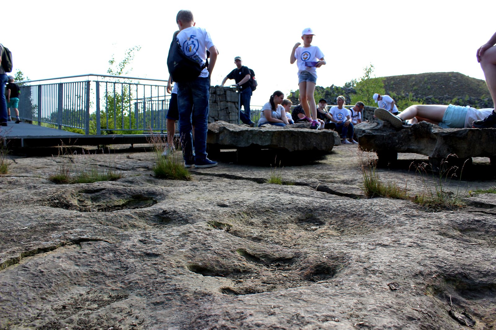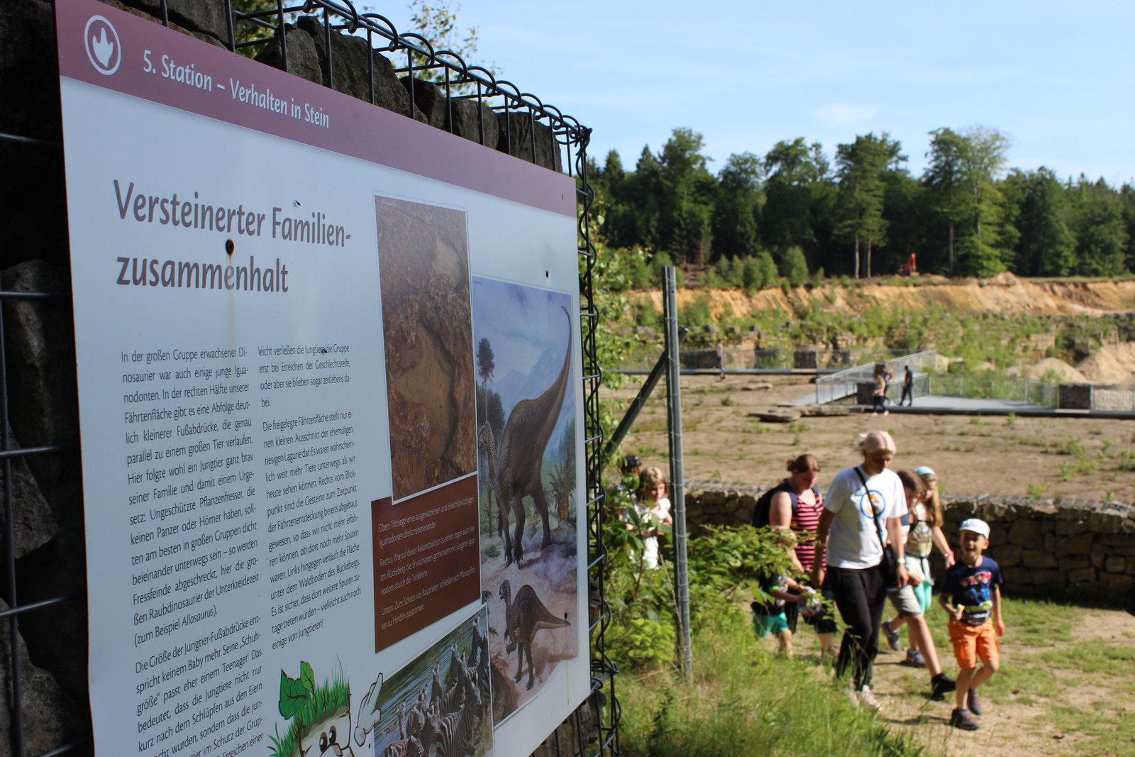 Interessant: Es finden sich im Steinbruch nicht nur Fährten von erwachsenen Dinosauriern, sondern auch von Jungtieren. Es waren hier also bereits vor vielen Millionen Jahren Familien unterwegs. Als „versteinerter Familienzusammenhalt“ wird das auf einer Info-Tafel beschrieben.