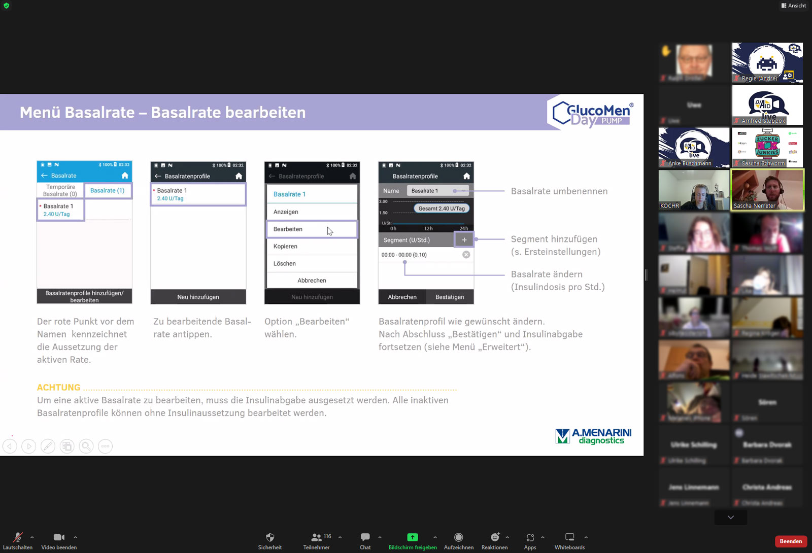 Sachkundig führten Rebecca Koch und Sascha Nerreter von A. Menarini Diagnostics – das Unternehmen vertreibt die Pumpe des Herstellers "Eoflow" in Europa exklusiv – durch eine Präsentation. Hier wäre an der einen oder anderen Stelle etwas weniger vielleicht sogar mehr gewesen. Gerade in Anbetracht der Tatsache, dass die beiden Vortragenden vergleichsweise wenig Zeit mitgebracht hatten, ging der Vortrag speziell beim Themenfeld „Bedienung des Steuergerätes“ in seiner Detailfülle schon beinahe in Richtung einer technischen Einführung, statt dem eher allgemein interessierten Publikum einen einfach zugänglichen Überblick der wichtigsten Funktionen zu geben. Anstelle der sehr ausführlichen Vorstellung der Menüführung wäre da wohl der eigentlich angekündigte und dann der Zeit zum Opfer gefallene Blick auf das schon eine Weile erhältliche „GlucoMen Day CGM“ gefragt gewesen.