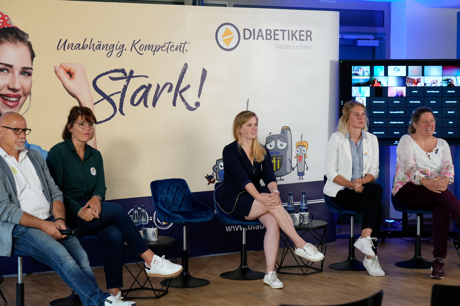 In der anschließenden und von Dr. med. Sandra Schlüter, Diabetelogin aus Northeim und im Vorstand der AG Diabetes + Technologie, gleichermaßen kompetent wie unterhaltsam geleiteten Diskussion gab es dann die Gelegenheit, Fragen zu stellen. Davon wurde dann auch reger Gebrauch gemacht; und zwar gleichermaßen vor Ort in Oldau per werfbarem Mikrofon-Würfel als auch aus der Onlinegemeinde heraus. Dabei bezogen sich die Fragen – wo man schon mal gleich mehrere Technik-Vertreterinnen und -Vertreter beisammen hatte – häufig darauf, was die einzelnen Hersteller in einem bestimmten Themenfeld bieten können. Wer dann immer noch nicht genug wusste, hatte im Anschluss vor Ort auch die Möglichkeit am Dexcom-Infostand bei Anne Rössler Fragen rund um den gebräuchlichsten Sensor in AID-Systemen zu stellen.