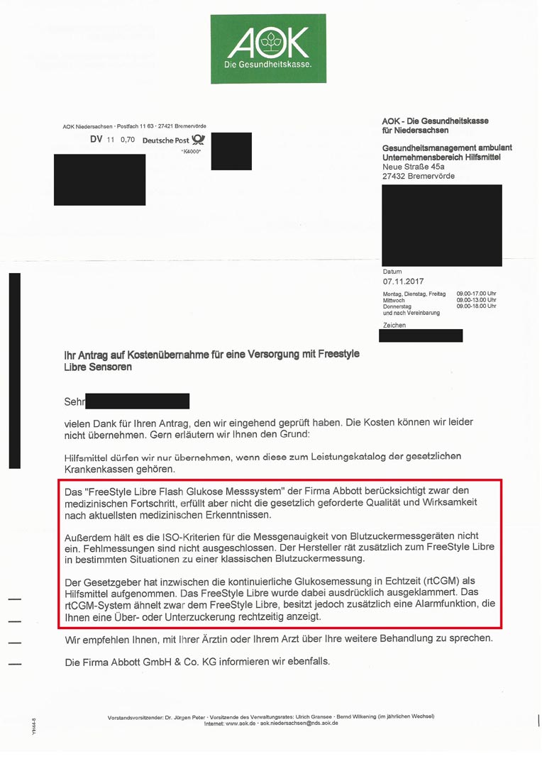 Die Pointe der AOK Niedersachsen: „Der Gesetzgeber hat inzwischen die kontinuierliche Glukosemessung in Echtzeit (rtCGM) als Hilfsmittel aufgenommen. Das FreeStyle Libre wurde ausdrücklich ausgeklammert. Das rtCGM-System ähnelt zwar dem FreeStyle Libre, besitzt jedoch zusätzlich eine Alarmfunktion, die Ihnen eine Über- oder Unterzuckerung rechtzeitig anzeigt.“