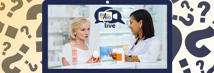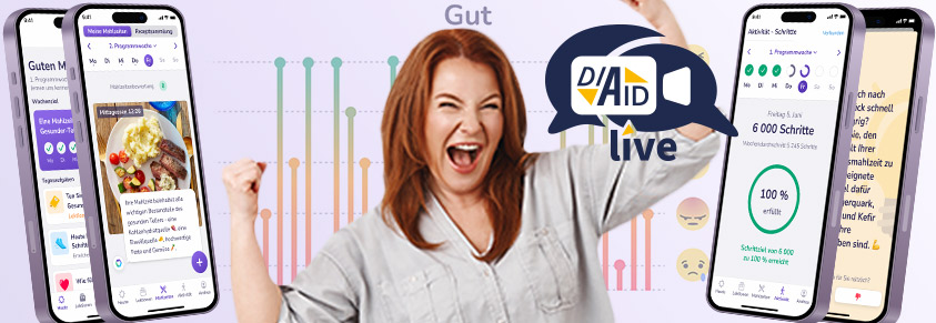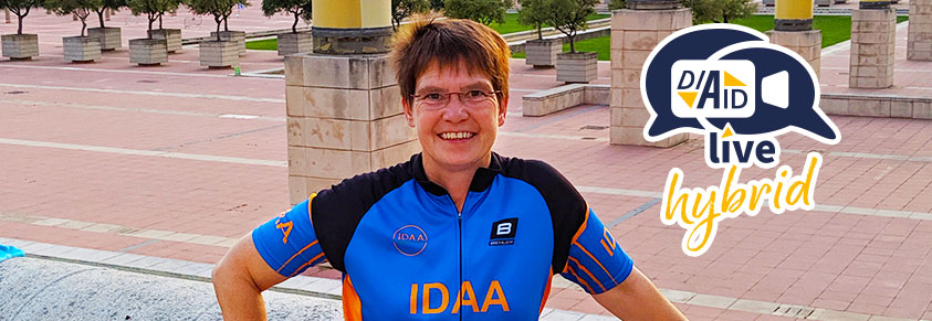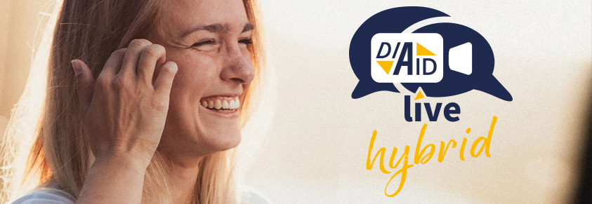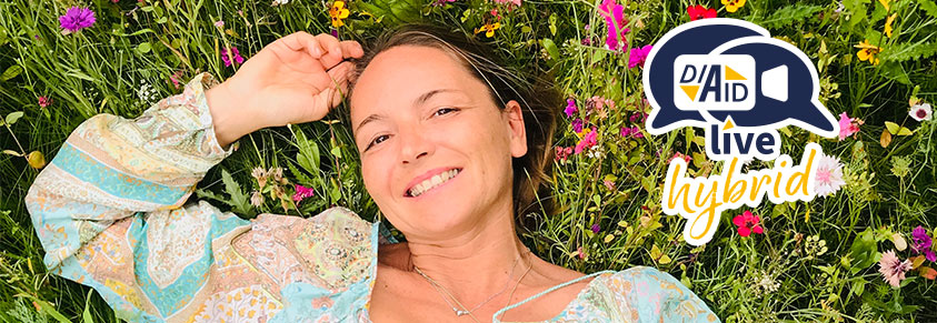 Katja Schaaf auf einer Wiese, daneben das DIA-AID live hybrid Logo