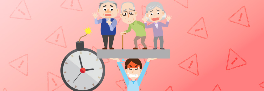 Ein junger Mann stemmt eine Platte mit 3 Senioren darauf, er ist angestrengt. Im Hintergrund eine Uhr in Form einer Bombe