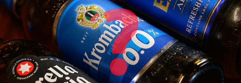 Mehrere alkoholfreie Biere, davor ein rotes Fragezeichen