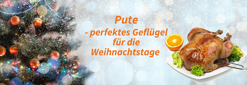 Ein Weihnachtsbaum und ein fertig zubereiteter Putenbraten sind zu sehen. Zwischen diesen Elementen steht: "Pute - perfektes Geflügel für die Weihnachtstage