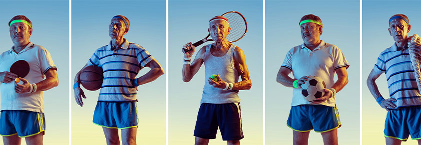 Collage 5 älterer Männer in Sportkleidung, verschiedene Aktivitäten