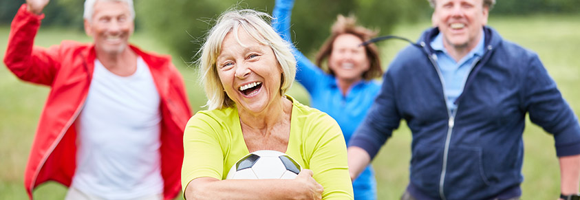 Eine ältere Dame hält einen Fußball in der Hand. Im Hintergrund freut sich eine Gruppe älterer Männer.
