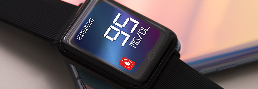 Eine Anzeige zeigt einen HbA1c von 6, im Hintergrund Wasser