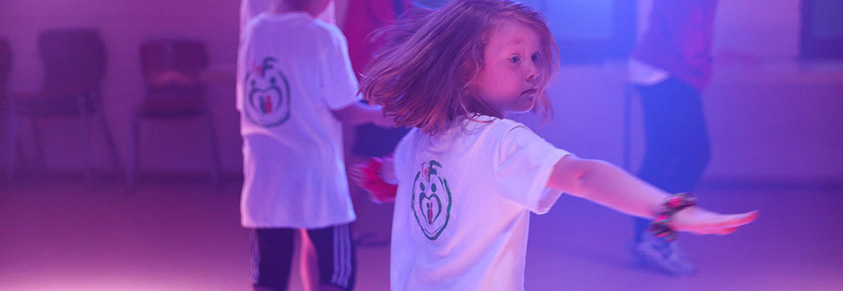 Ein Mädchen mit der Aufschrift "Sicher & Stark" auf dem Rücken
